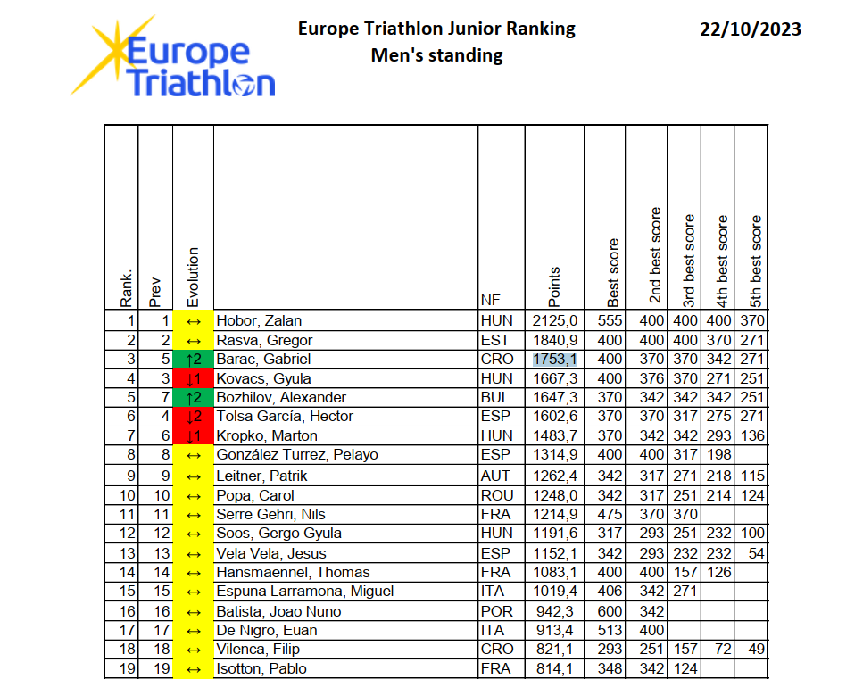 Gabrielov cilj nastupa na zadfje dvije utrke sezone je bio da prvi dan proba ostvariti plasman među prvom petoricom sportaša čime bi se plasirao na treće mjesto Evropskog juniorskog Kupa a drugi dan da proba osvojiti prve bodove u seniorskoj konkurenciji. Na juniorskoj utrci Gabriel je isplivao među vodećima i na bicikl kreće u prvoj grupi od deset biciklista, vozi kontrolirano i održava razmak ispred velike druge grupe. Na trčanje se kreće dosta jako, Gabriel drži tempo s prvom dvojicom do prvog okreta, nakon okreta Gabriel posustaje i na kraju ulazi u cilj kao četvrtoplasirani sa vremenom 00:55:43 i 14sek zaostatkam za prvoplasiranim. Ovim plasmanom Gabriel se popeo na treće mjesto ljestvice europskih juniora gdje će i ostati jer je ovo bila posljednja utrka kupa ove sezone.